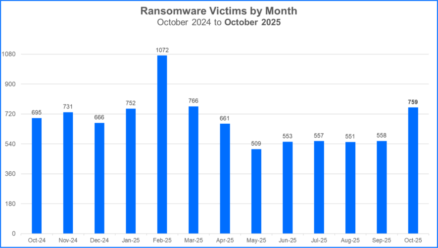 For this month's report, we analyzed data from October 1 to October 31 and recorded a total of 759 claimed ransomware victims. This is the third-highest month for the number of claimed victims within the past year.