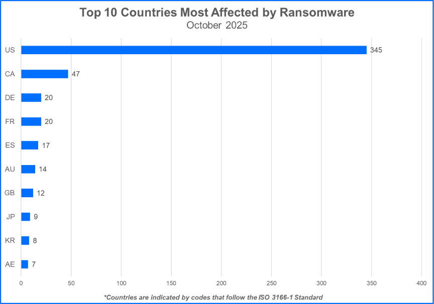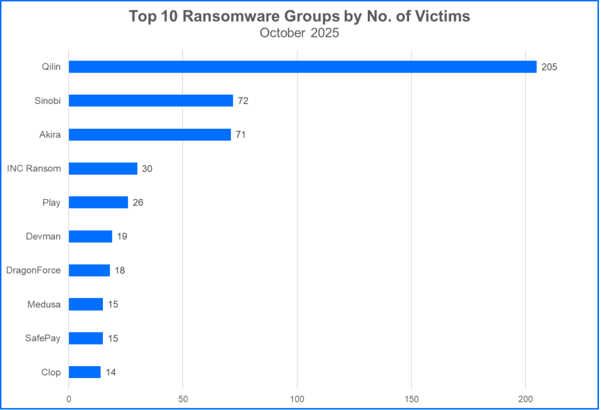 - Qilin ranks in the Top 10 for the sixth consecutive month: Qilin claimed 205 victims in October, which is a significant increase from their 96 victims reported in the last release. We have not seen the total number of victims claimed by an individual group exceed 200 since Clop’s milestone of surpassing 300 victims in February this year. As 2025 Q4 approaches its midpoint, QIlin’s presence and expansion puts both competing groups and victim organizations at risk.